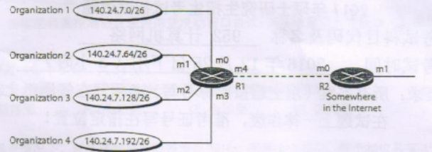 15.如下图所示的网络配置中,4 个组织结构的地址块被汇聚为一个较大的地址块,图中路由器 R2 的 m0 接口的网络地址是()
