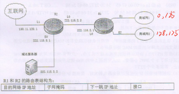 5.某公司网络拓扑图如下图,路由器 R1 通过接口 E1、E2 分别连接局域网 1、局域网 2 通过接口 L0 连接路由器 R2,并通过路由器 R2 连接域名服务器与互联网。R1的 L0 接口的 IP 地址是 222.118.2.1,R2的 L0 接口的地址是 222.118.2.2,L1接口的 IP 地址是 130.11.120.1,E0 接口的 IP 地址是 222.118.3.1,城名服务器的 IP 地址是 222.118.3.2