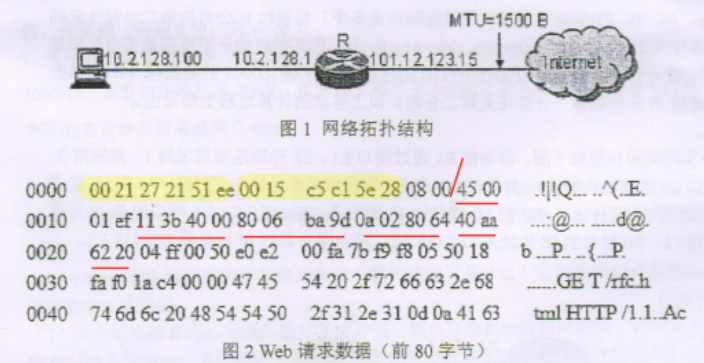 某主机的 MAC 地址为 00-15-C5-C1-5E-28,IP 地址为 10.2.128.100(私有地址)。图1是网络拓扑,图 2 是该主机进行 Web 请求的 1 个以太网数据前 80 个字节的十六进制及 ASCII 码内容