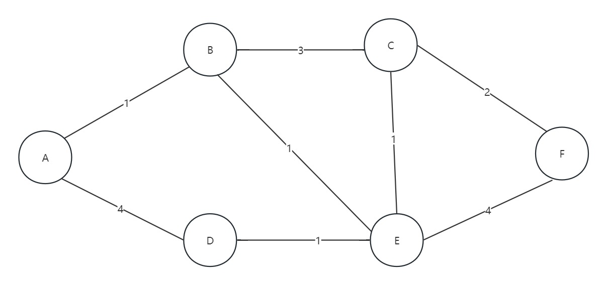 5.(12分) 按照下图给出的拓扑结构,使用 Dijkstra 算法求结点A 到结点F的最小费用路径,并给出以A为顶点的最小代价通路树